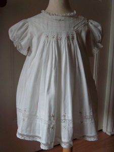 The pattern is “Corrinne Elise” by PBJK. I blogged about it a couple of weeks ago, when I was having trouble deciding how to finish the yoke. Overall, I liked the pattern. The styling was excellent and the directions offered both heirloom and non-heirloom options, as well as smocked and unsmocked version. You’ll have to forgive the pictures – my good camera is having battery issues and until I get it into the shop, I have to resort to my teeny-weeny Samsung :(.