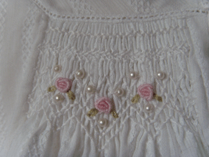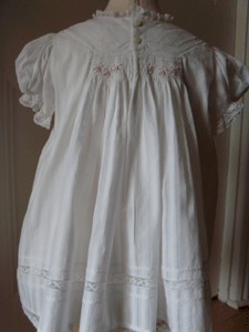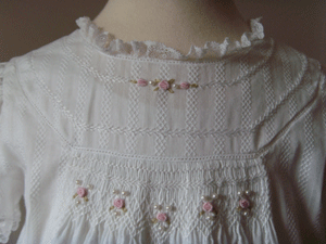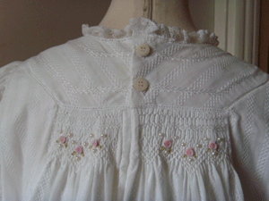 It was a weekend of ‘bits and pieces’ sewing. I made piping and finished up the few inches of remaining smocking on my niece’s winter bishop, getting it ready for construction; I sewed the underarm seams and started the bullions on her Christmas dress and I finished up this heirloom style dress too, marking its buttonholes, adding the buttons and popping out the petticoat.