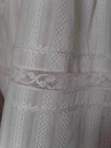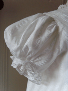Finally, I need to tell everyone just how much this dress cost me to make (or didn’t cost!). There’s this sense that heirloom sewing is prohibitively expensive. It certainly can be, if you’re using silk and expensive English netting and silk ribbon. But the whole dress, including the petticoat and the pattern, cost me less than $30. Seriously.